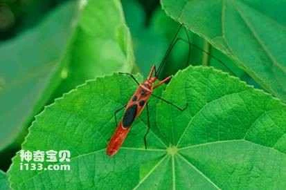 The male giant red bug has an extremely elongated abdomen, far exceeding its forewings, while the female's abdomen is wider and shorter. The male's antennae are exceptionally long. The entire body is red to vermilion, with brownish-black to black markings on the scutellum, a subtriangular spot in the middle of the pronotum, a row of large triangular spots in the center of the tarsal plate, the forewing membranes, and the sutures of the legs and abdominal segments. Host plants include cotton, solanum, and bamboo shoots. In Yunnan, it is mainly distributed in the southern region.