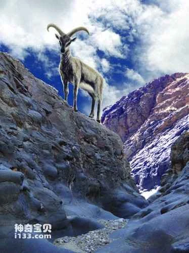 Figure 3. Reconstruction of a male Himalayan goat (drawn by Julie Selan), with the background being the widely exposed basement rock strata of the modern Zanda Basin (photograph by Wang Xiaoming).