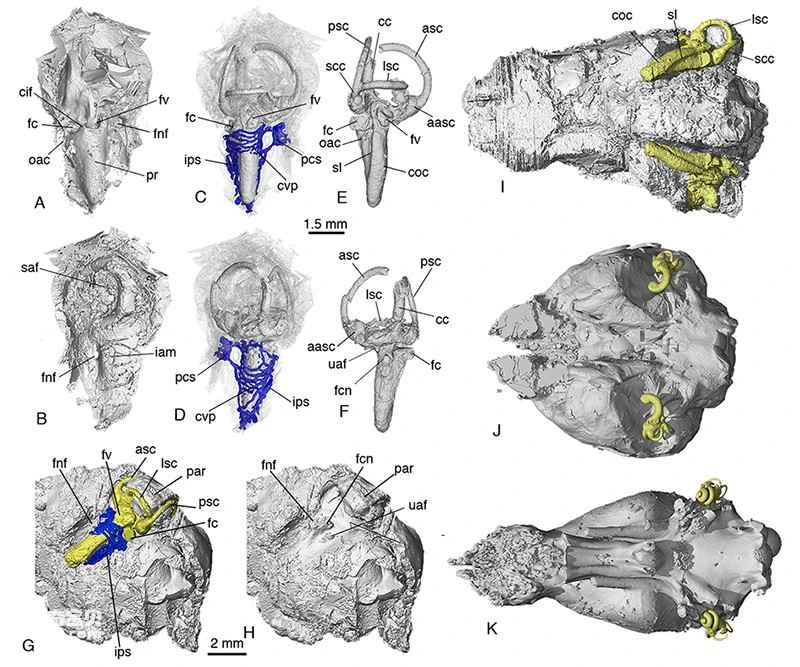 Figure 4. The structure of the inner ear and the morphology and relative relationship of the brain cavity in *Li's Protozoan* (AI), and a comparison with monotremes (J) and marsupials (K). Yellow represents the inner ear structure's endothelial model, and blue represents the inner ear's related vascular system (Image provided by Mao Fangyuan).