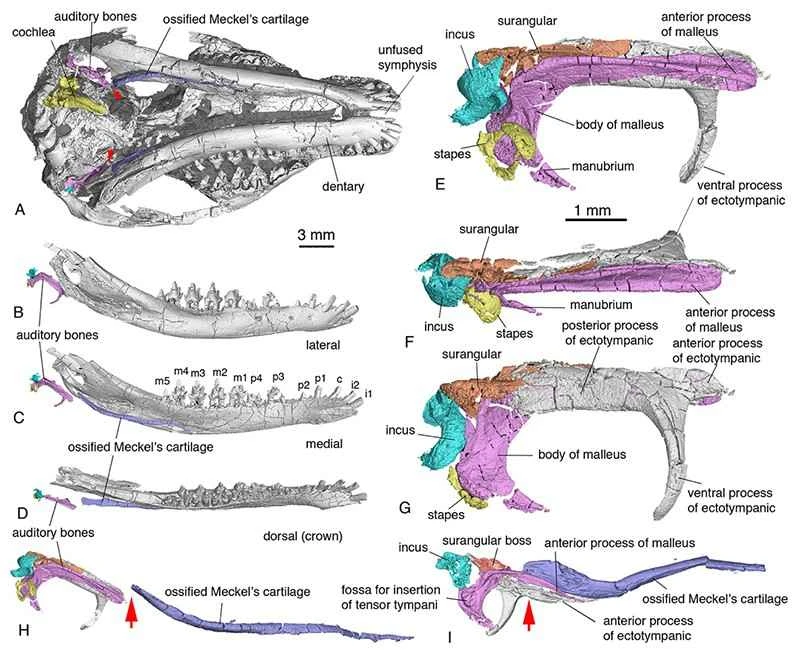 Thanks to the results of high-precision CT scans, *Triconodontia lijiri* also exhibits nearly complete morphological features of the auditory ossicles, a characteristic found in basal mammals (and even in all known Mesozoic mammals), providing credible fossil evidence for further in-depth research into the evolution of mammalian auditory ossicles. Particularly noteworthy is that, in addition to the stapes, malleus, ectotympanum, and incus found in all mammals, *Triconodontia lijiri* also retains the supraorbital bone. Since studies of the auditory ossicles of *Triconodontia* and *Arboretus ahoi* suggested the possibility of a supraorbital bone, increasing evidence suggests that the supraorbital bone entered the middle ear during early mammalian evolution. *Triconodontia lijiri* provides the most credible three-dimensional evidence of a supraorbital bone to date. In basal types of the Triconodontia-therapeutic lineage, the supraorbital bone is a plate-like structure, with its anterior projection remaining between the ectotympanum and malleus, and its posterior portion forming an anterior-posterior joint with the incus along with the malleus. The presence of the superior ossicle in basal mammals presents a challenge to paleomammalian research and modern developmental biology: was this ossicle directly lost during mammalian evolution, or how did it fuse with another part, resulting in the absence of the superior ossicle in the middle ear of extant species? Further fossil discoveries and more detailed developmental biological studies may answer this question. The inner ear, closely related to the middle ear ossicles and an important part of the auditory organ, also exhibits a unique evolutionary structure in the Triconodonts-theriformes lineage. Compared to extant mammals and monotremes, this lineage features a cochlear duct with secondary bony plates that extends linearly towards the middle of the skull base, with a rich network of reticular veins around the cochlea. The length and width of the cochlear duct in *Lisbeckia orientalis* even reach the limits of the petrous bone, and its volume is proportionally larger than the cranium, almost reaching its limit. This can be considered an evolutionary "experiment" of different elongation patterns in mammalian cochleas; to some extent, it supports the spiral structure of the theriform cochlea, representing a more feasible adaptive evolutionary direction for extending the cochlear duct within the limited space of the petrous bone. In any case, basal mammals (including humans) have enhanced their variability or evolutionary capacity through various experiments, and have ultimately succeeded in becoming one of the dominant players in Earth's ecosystem.