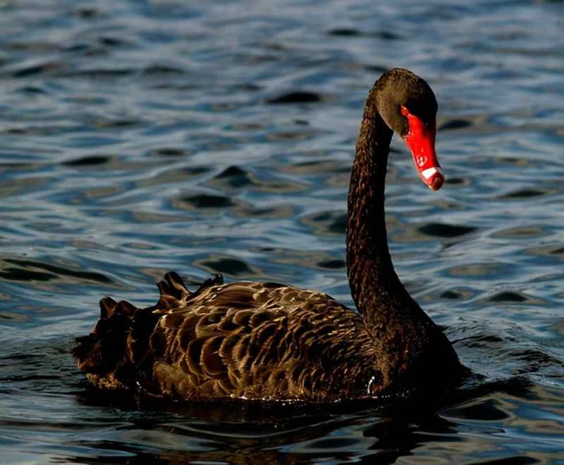 The black swan, native to Australia, is an important member of the swan family and a world-renowned ornamental bird. It is a large waterfowl belonging to the genus *Cygnus* in the family Anatidae, measuring 110-140 cm in length, with a wingspan of 160-200 cm and a weight of 3.7-8.75 kg. It possesses the longest neck among swan species. It is distributed in southwestern, southern, and eastern Australia. Later, it was introduced to Singapore, other countries, and parts of Western Europe. Black swans have black plumage, a red bill, and white wings. During the breeding season, they nest in wetlands, laying four to seven eggs. This species has also been introduced to New Zealand, and can be seen in Indonesia and New Guinea. These birds are herbivores, feeding on algae and aquatic plants, and using their long necks to reach deeper waters.