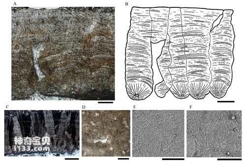 Figure 2. Microstructure of the eggshell of the jinguoensis oogen. et oosp. nov., A, B, E, F, scale bar = 0.2 mm; C, D, scale bar = 0.4 mm.