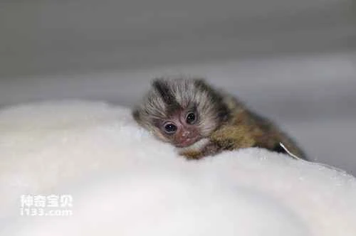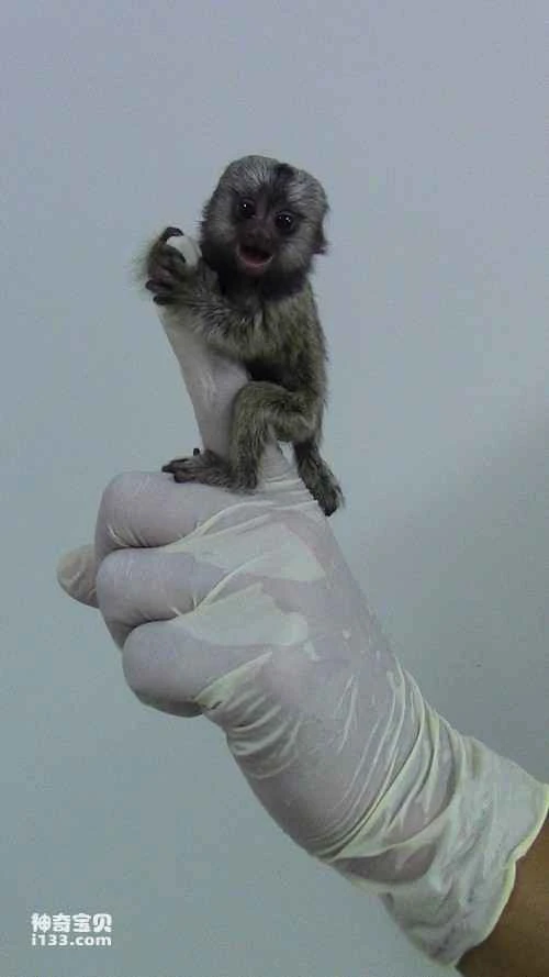 The most striking feature of these little monkeys is the tuft of cotton-like white hair on each of their ears, hence their name, the cotton-eared marmoset. Biologically, there are dozens of species of marmosets, with the cotton-eared marmoset being the most common, also known as the common marmoset. Even as adults, they are only about 20 centimeters long and weigh 300-400 grams, less than the weight of a bottle of ordinary mineral water. Newborn marmosets haven't yet grown their distinctive white ear hairs; they are about the length of an adult's finger and weigh only about 30 grams, easily able to hold a person's finger in their palm.