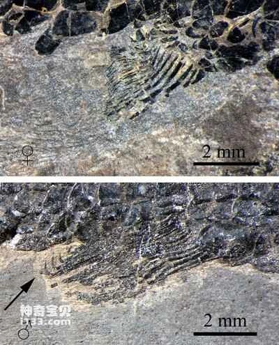 Figure 3: Comparison of the anal fins of male and female *Siniberis edulis*, with arrows indicating the hooks on the male's anal fin.