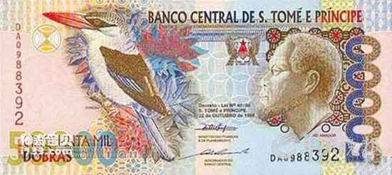 The Democratic Republic of São Tomé and Príncipe, located on the equatorial coast of West Africa, features a banknote with a striking image on the left side of a kingfisher endemic to the region, known for its exceptionally beautiful plumage. This kingfisher, also called the "Blue-breasted Kingfisher," is the largest kingfisher in Africa.