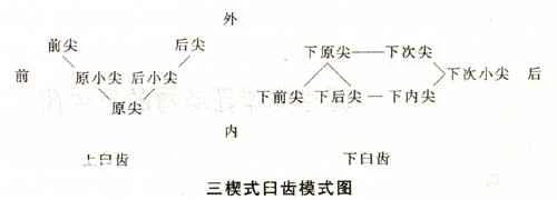 The so-called triwedge molar pattern refers to the upper and lower molars forming opposite triangles. The three principal cusps of the upper molars are called the primitive cusp, the anterior cusp, and the posterior cusp; the former is located on the inner side of the tooth, while the latter two are on the outer side. In addition, between the principal cusps of the upper molars are two intermediate cusps, namely the primitive cusp and the posterior cusp. On the lower molars, the outer cusp is called the lower primitive cusp, and the two inner cusps are called the lower anterior cusp and the lower posterior cusp. The calcaneus of the lower molars usually also has three cusps: the outer one is called the subciliary cusp, the inner one is called the submedial cusp, and the last one, the cusp at the very back of the basin-shaped calcaneus, is called the subciliary cusp.