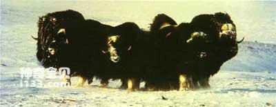 Musk oxen possess a pair of incredibly strong horns, powerful weapons for defense and combat; their bodies are covered in long, trailing hair that reaches the ground, beneath which grows a thick layer of high-quality down, which the Inuit call "quivet"; their ears are small and covered in dense hair; their nose is the only exposed part of their body. The musk ox's body structure effectively reduces heat loss, allowing it to withstand wind speeds of up to 96 kilometers per hour and temperatures as low as -40°C. They thrive in such harsh environments. In the depths of winter, warm air currents sometimes visit the Arctic, bringing heavy rain. The poor musk oxen are often soaked to the bone, and when the cold wind blows, the rainwater freezes into a thick layer of ice, turning them into giant ice rudders, unable to move. Disaster ensues, and some musk oxen freeze to death as a result.