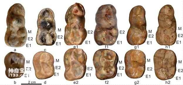 Figure 2. Comparison of dental structural variations among African subterranean bear (af), Heinz subterranean bear (g), and Indian bear (h). In the figure, M represents the posterior inferior cusp, E1 is the posterior inferior medial cusp, and E2 is the anterior inferior medial cusp (image provided by Jiang Zuoqigao).