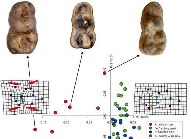 The most obvious difference between Indian bears and African coyotes lies in the pattern of the inner cusp of their lower carnassial teeth. In Indian bears, this region has three cusps: the largest, anterior posterior cusp, and two posterior inner cusps. Generally, the anterior cusp is larger than the posterior one, resulting in a series of decreasing cusps from front to back. In African coyotes, this region has only two cusps: the larger anterior one and the smaller posterior one. Traditionally, it is believed that the two cusps in African coyotes correspond to the anterior inner cusp in Indian bears, while the posterior inner cusp is degenerate and disappears. However, no specimens support this hypothesis; no specimen with an intermediate morphology has been found (theoretically, the posterior cusp should be larger, while the posterior inner cusp should be significantly smaller). Hendey, in describing the African coyote *Agriotherium africanum*, discovered a series of variations that do not conform to the above hypothesis. In some African coyote bears, the normally largest posterior cusp becomes unusually small, while the anterior medial cusp enlarges, and the posterior medial cusp also slightly enlarges. This led to the proposal that the two medial cusps in coyote bears should be the result of simultaneous enlargement of both medial cusps, while the original posterior cusp disappears and degenerates. Unfortunately, Hendey's argument was too simplistic, and his views did not receive a response from international peers. The coyote bear Hendey discovered in North America recently exhibits morphology similar to some individuals of African coyote bears, with a very small posterior cusp and simultaneous enlargement of both medial cusps. This suggests that this variation is not unique to African coyote bears but may be a widespread variation pattern in early coyote bears. Taking this opportunity, researchers reviewed the dental variations of African coyote bears in detail. Using geometric morphology methods, combined with knowledge of dental arch homology and dental development, they demonstrated that Hendey's view was correct: the two cusps in this region of the coyote bear should be two enlarged medial cusps, while the posterior cusp degenerates and disappears. The species name of this new species is dedicated to Mr. Hendey. The authors also found that the lower carnassial structure of the North American “Agriotherium” schneideri is very similar to that of the Indian bear, but quite different from that of the coyote, so its phylogenetic position needs further study.