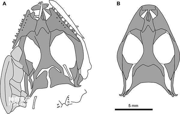 Comprehensive line drawing of the holotype skull of the red mountain lizard and its reconstruction line drawing (Image provided by Dong Liping)
