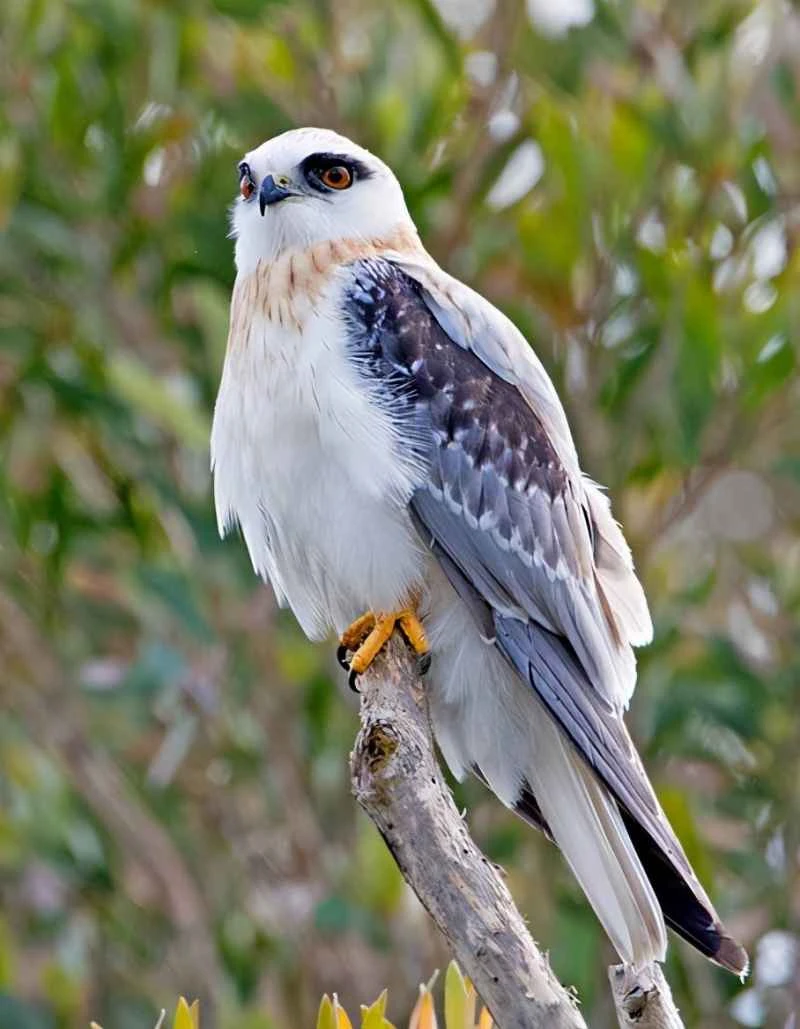 The Black-shouldered Kite is a medium-sized bird of prey with a striking appearance, featuring black or white plumage. It typically measures 33-38 centimeters in length and possesses exceptional flying and gliding abilities; its ability to hover in mid-air is unique among eagles. It has distinctly black and white plumage, bright red eyes, and yellow legs. Its diet consists mainly of rodents, insects, small birds, hares, and reptiles found in fields.