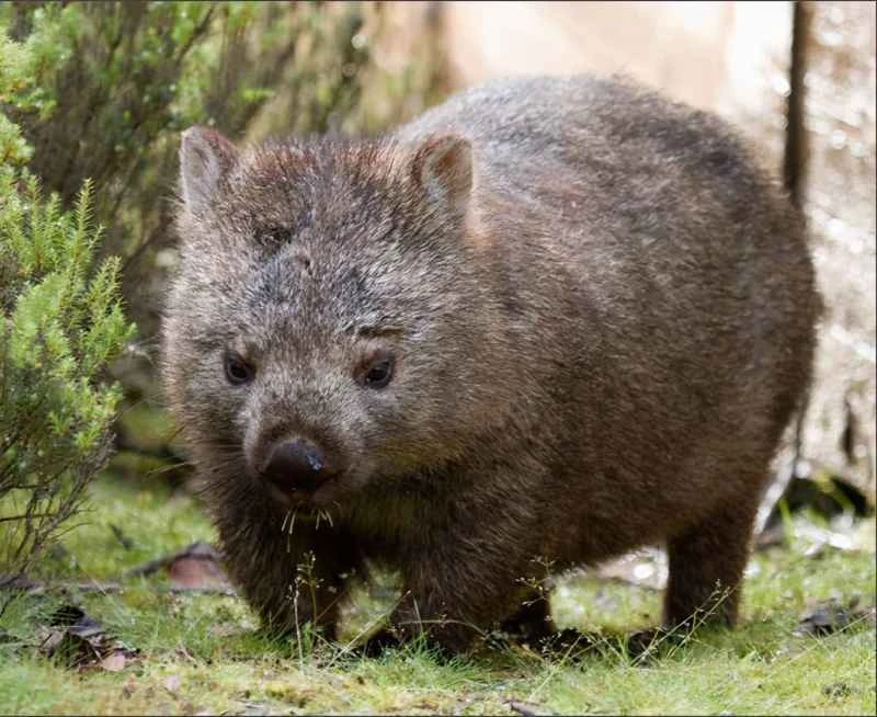 Wombats are robust, bear-like animals with small eyes and a rat-like face. They can weigh up to 35 kilograms, have a slightly flattened skull, a relatively short snout, short, muscular legs, and a body length of about 1 meter. They also have a short tail and are shorter and stockier than koalas. These uniquely shaped animals live in temperate regions, inhabiting burrowing environments suitable for forests, hills, and coastal areas. They range in size from 2.5 to 3.5 feet and dig burrows up to 1 meter deep, venturing out at night to forage. They are social animals and herbivores, feeding on grass, roots, shrubs, moss, and bark. They can run at speeds of up to 40 miles per hour, but only for short distances. The average lifespan of a wombat in the wild is 5 years, while in captivity it is 30 years.